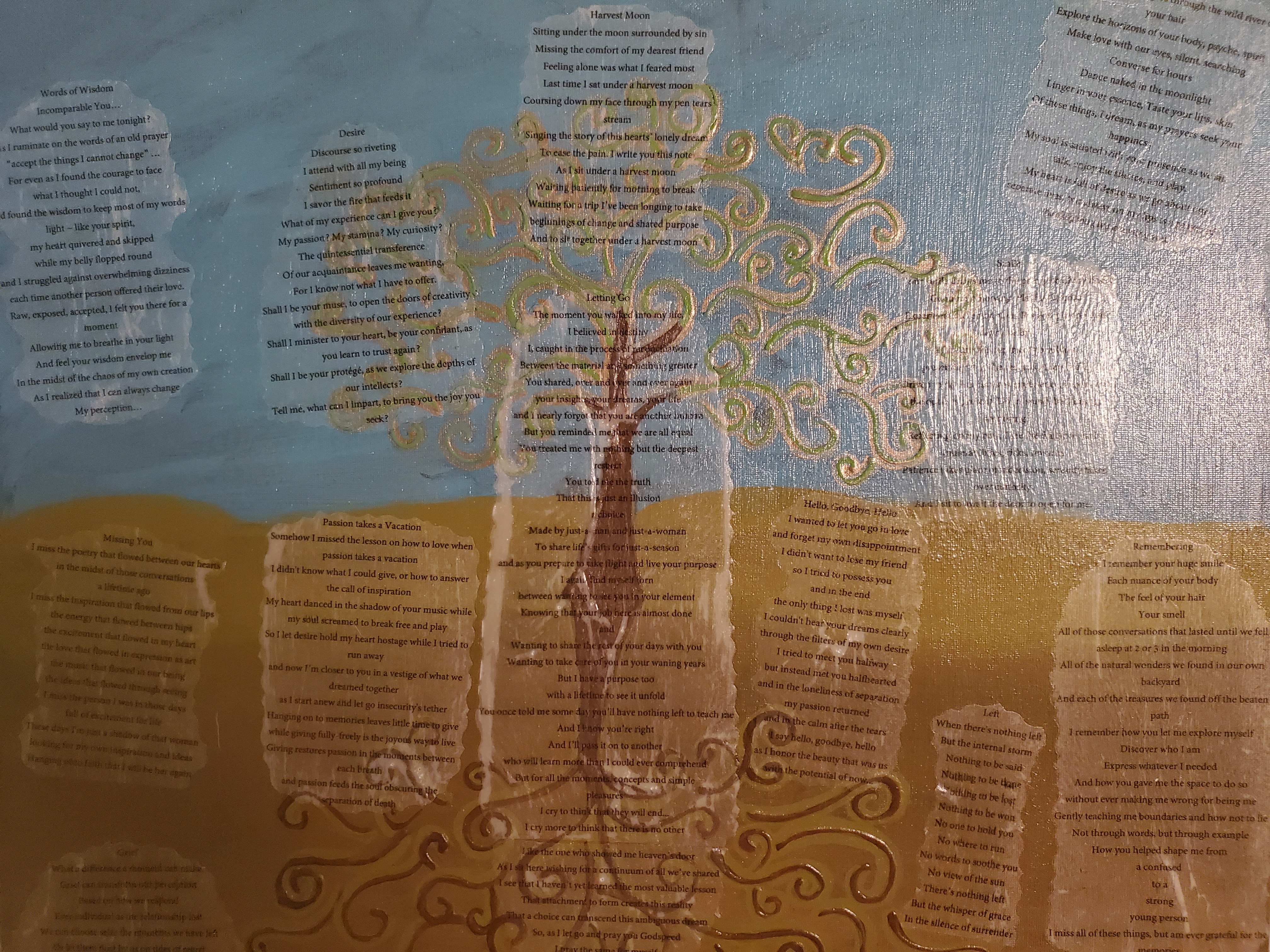 Below are some examples of Del’s pieces combine poetry, painting, and collage that represent various aspects of their life story and work.